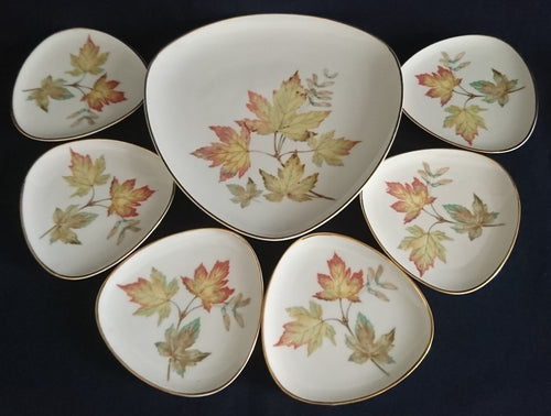 7er Set ABLAGETELLERCHEN & DESSERTTELLER "Diadem" - Porzellan, Goldrand Blatt Blätter Herbstlaub Motiv Dekor