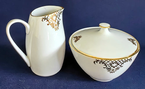 • 3er Set MILCHKÄNNCHEN & ZUCKERDOSE MIT DECKEL - Porzellan, Goldrand Geometrisch Abstrakt Symbol Zeichen Wappen Dekor Motiv
