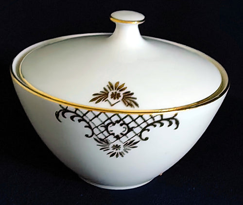 • ZUCKERDOSE MIT DECKEL - Porzellan, Goldrand Geometrisch Abstrakt Symbol Zeichen Wappen Dekor Motiv