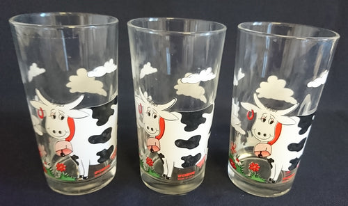 3er Set GETRÄNKE SAMMELGLÄSER - Press- / Hartglas, Gepiercte Gefleckte Milchkuh Wiesen Motiv Dekor