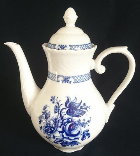 KAFFEEKANNE MIT DECKEL - Porzellan, Kobalt Rosen Blumenstrauß Blätter Pflanze Blüten Abstrakt Geometrisches Relief Dekor