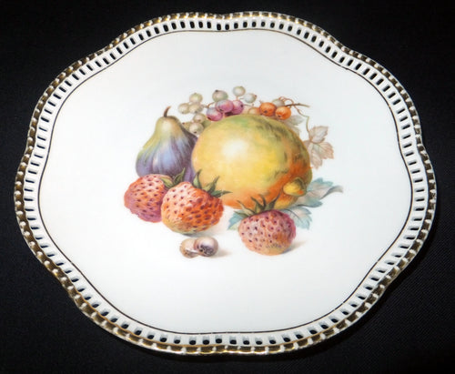 DEKORATIONS DESSERTTELLER - Porzellan, durchbrochen, Apfel Feige Erdbeer Motiv Goldrand Dekor